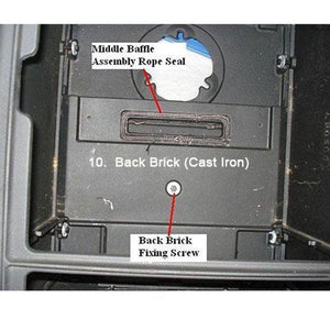 Remove the two M6 x 20mm Hex Head bolts to release the middle baffle assembly from the back brick (10). Before replacing the middle baffle assembly, ensure that the rope seal on the back brick is not damaged and replace with 430mm length of Ø8mm rope (CA0802) if required. To remove the back brick, the grate frame (16) must be removed and the M6 x 30mm Hex Head bolt (with two 7mm ID x 22mm OD washers) fixing the back brick to the back casting (4) must also be removed. When refitting the back brick, remove all cement debris from the groove on the back casting and reseal with fire cement.